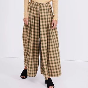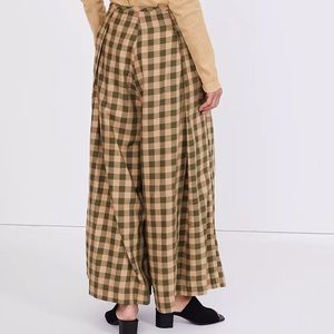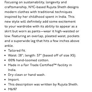 This new style will definitely add some excitement to your wardrobe with its ability to appear as a skirt but worn as pants—wear it high-waisted or low. Featuring an overlap, pleated waist, pockets and a superwide leg that hits a few inches above ankle.