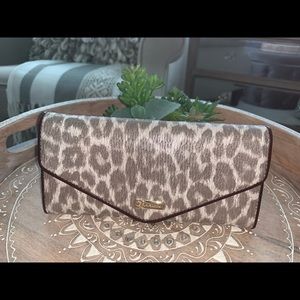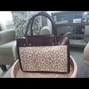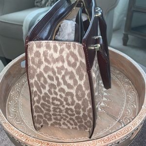 Featured in Ivory Elara, a luxurious Italian leather with an all-over leopard print and a shimmery metallic foil finish. Smooth leather trim in a rich espresso brown adds contrast. Genuine Italian leather.