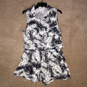 Splendid Romper (shorts). Navy & white palm fronds print. Blouson style top half. Button up the front w/a front chest pocket. 3.5” inseam. Elastic waist. 2 side slant pockets. 100% rayon. Dry clean. Size medium. Super lightweight, comfortable, very on trend and stylish. Excellent condition!