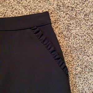 Kate Spade ruffle-pocket A-line skirt. Zip back with hook-and-eye closure. Material is 90% polyester and 10% elastane. DRY CLEAN ONLY. Lying flat, measures about 13.25 inches across the waist and about 18.5 inches from waist to hem. Size 0. ❗️Sorry, I do not trade.❗️