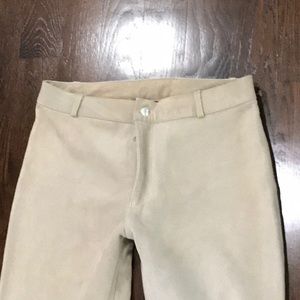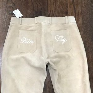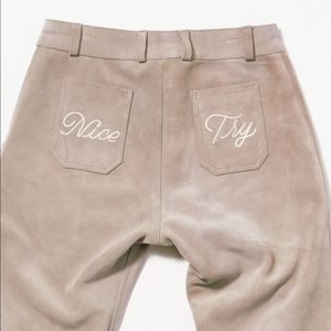 Nice try! The perfect mid rise suede ankle crop pant with custom embroidered font by Brooklyn Artist Jen Musssari on the back pockets.