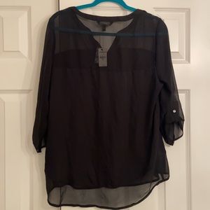 Black, mixed media silk and chiffon blouse, with iridescent white buttons and 3/4 length sleeves. Brand new, never worn, with tags on.