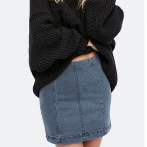 Super stretchy denim - mini skirt with exposed seam detailing. Zipper at back.