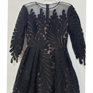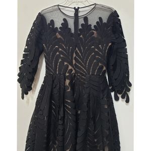 Leafy applique lends intricate texture to this sophisticated midi dress with a chic illusion neckline and three-quarter sleeves.