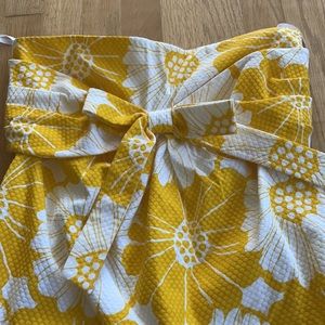Adorable strapless Kate Spade dress. Yellow and white floral print on a raised textured background. Cute bow under the bust. Zips in back. Flawless condition, worn once. Smoke free home.