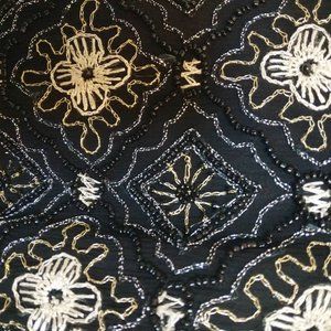 Fully beaded, front and back, Cream, gold, pewter and black. Banded around neck, arms, hem with tiny, glass, seed beads. All done by hand. Excellent Vintage Condition!