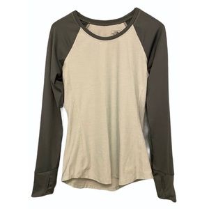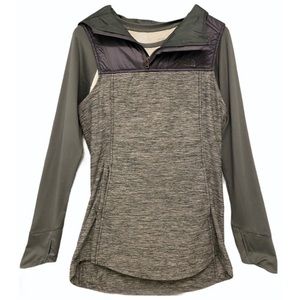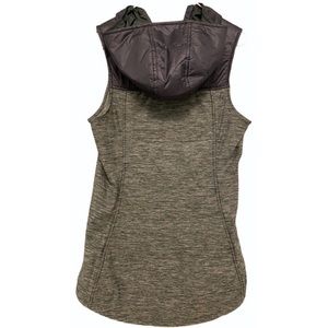 Vest Size: S/P. Long sleeve size: XS Style: half zipped at top, hooded, lightweight, has front pockets, Color: olive green and gray mix color Condition: gently used Approximate measurements: (laying flat across) pit to pit: 18’”, Shoulder to hem front 27” Smoke free home Please feel free to ask any questions and make an offer ! Note: long sleeve and vest come separate