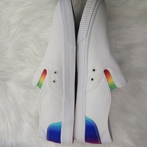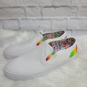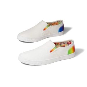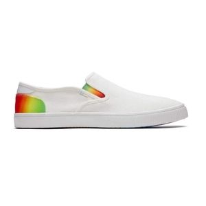 Step into effortless style and comfort with these TOMS Baja Unitu Slip-On Sneakers! 🌟 Featuring a white canvas upper with vibrant rainbow accents 🌈, these shoes offer a lightweight, eco-friendly design with OrthoLite® Eco LT Hybrid™ insoles. The elastic gore sides ensure an easy slip-on fit, while the vulcanized rubber outsole provides durable traction. Perfect for casual wear, Pride events, or everyday comfort! 🎉
