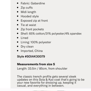 Soia & Kyo Arabella Water repellent Trench Coat with hood. Wrinkle from being packed away, but in very good condition. Smoke free pet free home and owner.