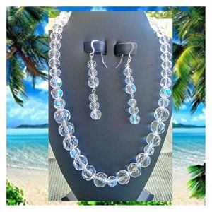 Crystal Faceted Clear beads, 8, 10, & 14mm. Necklace length 18” with sterling silver clasp. Long dangling earrings, mixture of 8, 10 & 14mm crystal beads with sterling silver earring hooks.