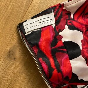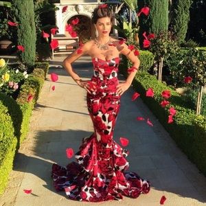 Michael Costello strapless mermaid style satin gown with train. Zips in back. Worn once. Bottom is lined with horsehair so it’s very flouncy and flamenco-dancer-esque. 😊 The most beautiful dress!! Size 0-2. Waist measures 24” and bust 36. The fabric has a bit of stretch to it.