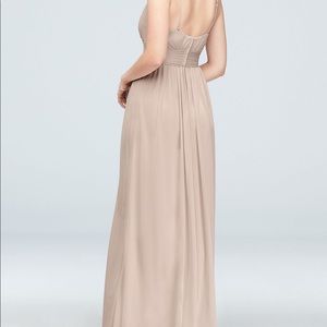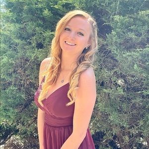Size 0. Worn only once for a wedding 9.5.21. Bra cups added. Hemmed. Straps are adjustable. I am 5’3 and wore a 3 inch heel. Like new. Great condition!!!