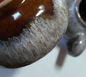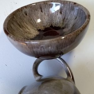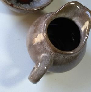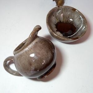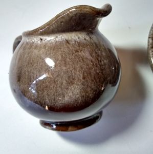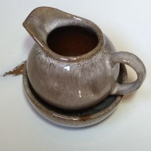 Mini Saucer & Pitcher Set (2 Items = 1 Price Together); No Brand; Unknown Specific Materials - Clay/Pottery/Paint; Excellent Pre-Owned Condition - No Flaws/Chips/Stains/Cracks/Missing Pieces/Broken Pieces/Etc.; Artisan Craftsmanship - Handmade; Glazed Pottery; Color - Brown/Light Brown/Taupe/Gray/White Tones; Appx. Dimension - Pitcher: (Spout to Handle) 3.5"/(Diameter Top) 1.75"/(Base) 1"/(Handle) 1"/(Height) 2.75" & Saucer: (Diameter) 3"/(Base) 1"/(Height) 1.5"; Perfect for Charcuterie Board 🌟