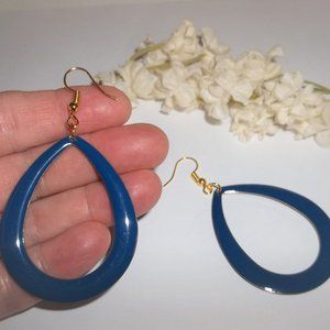 You will fall in love with these teardrop shaped hoops! Brand new and handmade by me - wvluckygirl. Done with royal blue enameled hoops with a gold trim. They have gold toned costume jewelry french hooks for pierced ears. 2 5/8 inches tall & 1 1/5 inch wide. Each single earring weighs 4.7 grams. Would make a great gift idea for her. You can never have enough hoops!
