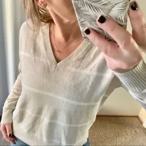 Neutrals never go out of style! The deets: bridgette neutral stripe sweater | color: neutral stripe (a lovely blend of tan/gray) | loft brand | that polished slouchy chic vibe you want | constructed of a super duper soft knit + flattering v-neck + modern-cool dropped shoulders + long sleeves + relaxed fit + lands @ hip | material: 60% acrylic + 40% nylon | measurements: (small) 19.5” bust + 23” length & (med) 23” bust + 23” length | no trades/lowball offers pls
