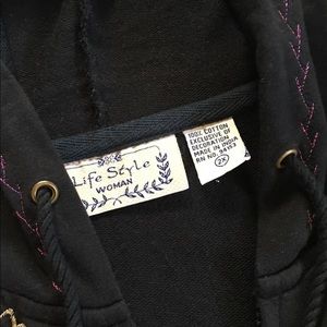Lifestyle woman jacket with hoodie & zipper. No pockets. Never used great condition. Black with pretty stitching details & fabric designs sewed on.