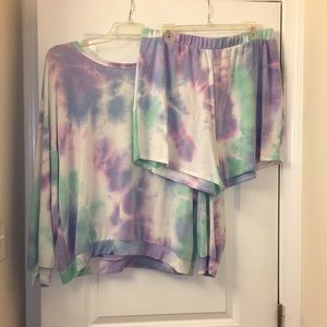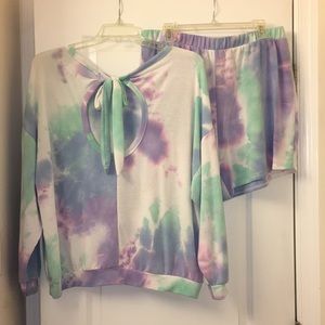 NWT***Fashion Nova “Bright Out There” Tie Dye short set. Size 2x. Material is a lightweight sweatsuit/jogger material. Cut out and tie on the back of sweatshirt. Great for lounging.