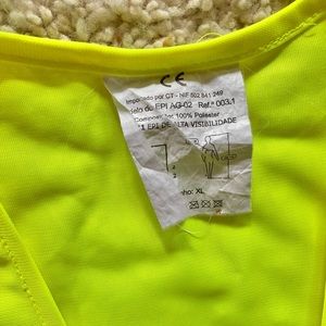 Lightweight safety/construction vest in neon, with silver reflective material around the center - very easy to see in the dark. Originally from Spain.