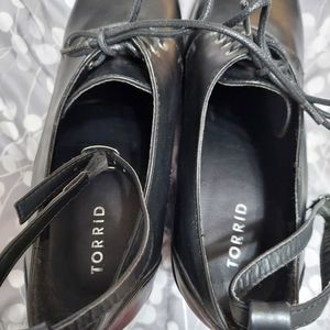 Calling all witches goths schoolgirl cosplay anime trans nb persons - you need these platforms! From Torrid in black vegan leather, like new condition. Classic Oxford lace-up style with a big chunky lug sole and adorable removable ankle strap. As you can see they're definitely wide width, size 12 (or men's 11), and have plenty of notches on the strap for all ankles! Heel is 4", platform is 1.5". Reasonable offers welcome. I will always accept or counter with my lowest.