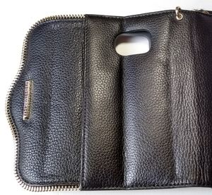 Excellent, Pre-Owned Gently Used Condition; No Visible Wear/Tears/Holes/Stains/Unthreading/Etc. - Indentation for Fold Case Stand (Refer to Photo Images); Slim, Sleek Style; Device Protection; 2 Small Card Holders & 1 Bigger Behind; Case Mate Interior Phone Case; Snap Closure & Hook, Attachable Wristlet; Gold Color Zipper Exterior Design; Magnetic Closure; Black Color Pebble Texture Material/Leather/Excellent Quality; Gray Microsuede; Order Does Not Come with Original Box; Appx. Size - 5.5" X 3"