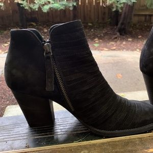 Precision slicing creates an abstract ruching effect up the vamp of a classic bootie with a chunky setback heel.Heel style: block/chunky