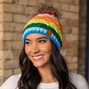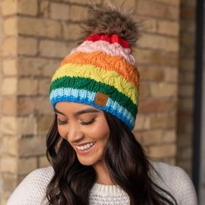 SOLD OUT Rainbow Cable Knit Fleece Lined Faux Fur Pompom Beanie Women's Winter