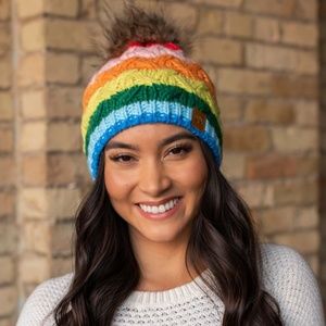 Multi colored rainbow stripe printed knit beanie with a warm fleece lining and a faux fur pompom. Makes a great gift!