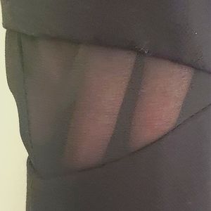 Shoulder cutouts, mesh panel inserts at waist, slit on left side at hem
