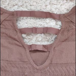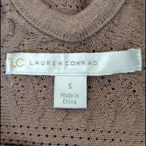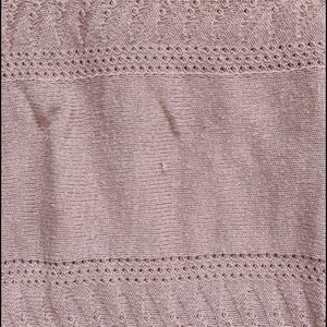 Excellent condition, no rips, stains, or holes. Only one minor pull that I see (see pictures). Thin light brown tunic length sweater with three quarter length sleeves. Knit solid and see through patterned stripes. Has a cute cut out and ribbon bow detail on the upper back.