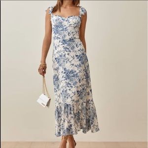 This midi length dress has a ruffle edged neckline, adjustable strap ties, and a trumpet skirt.