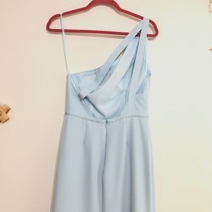 One-shoulder jersey mermaid gown with a low, open strappy back and soft sweeping train.