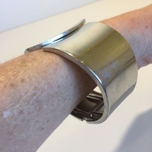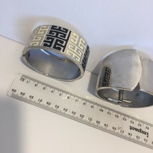 Two lovely silver tone bracelets needing a new home. Both hinged for ease of on off. One with enamel work in a cream black geometric pattern. The other is a wider cuff style with asymmetrical ends. Rocking an 80s vibe here
