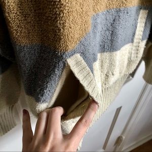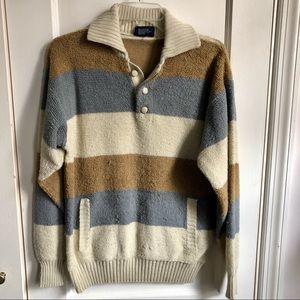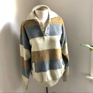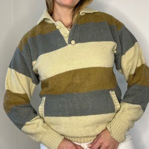 Vintage Neutral Terry Cloth Knit Striped Sweater Top. Banded hem and wrist cuffs. Terry cloth knit fabric. Tan, gray and cream stripe. 3 button closure. Collar. Front functional pockets. Perfect for fall. Causal loungewear sweater. 90s. Brand is VIP.