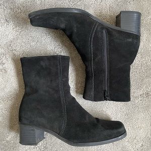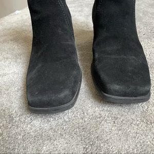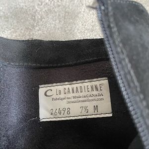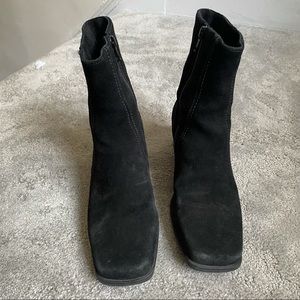 Excellent quality waterproof suede square toe boots by La Canadienne. Scuffs, marks, and wear throughout (I think the photos actually make them look more work than they are). Have a ton of life left. Approx 2” heel.