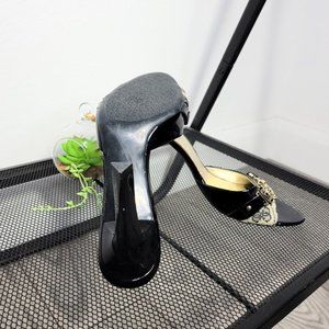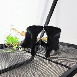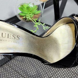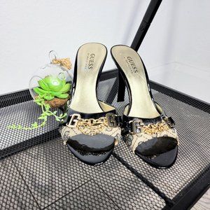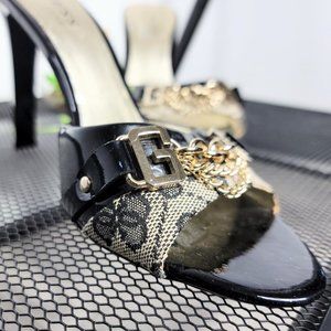 Guess By Marciano Gwadeline Black Leather Gold Chain 3" Heeled Sandals Size 7.5M. They feature black & cream monogram with patent leather top strap along with gold 'G' with three chain connection, and triangular shiny heel. Made of a leather textile upper and manmade balance. There is some wear on inside soles.