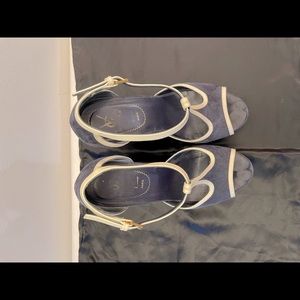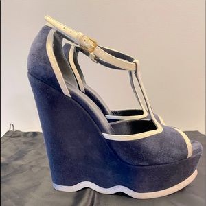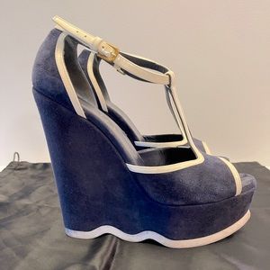 Yves Saint Laurent navy blue suede platform wedge with White patent leather trim. Size 38 fits like US 8. Great condition. Gently used. Made in Spain. Comes with YSL satin shoe bag.