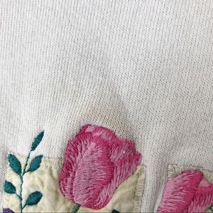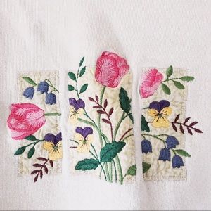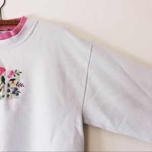 Vintage grandma flower graphic sweatshirt. Cute pink double collar with fairy kei floral garden graphic embroidered on front. White, oversized fit, see photos for some stains, hardly noticeable in person. No Tag size
