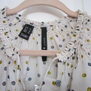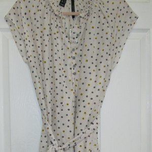 MNG by Mango Polka Dot Dress. Cream dress with Purple/Blue and Yellow Dots. Adorable neckline, button down, tie waist.