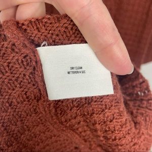 Anthropologie Sparrow Cable Heavens Sweater Midi Dress in Rust Brown and Women's Size XS. 40% acrylic, 30% wool, 25% nylon and 5% cashmere. Very good pre-loved condition. No visible flaws. Retails for $188 USD (approximately $261 CAD).