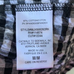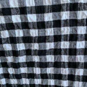 This is a unique, checkered top from Pleione, size Medium. The seersucker-textured/weight fabric, 97% cotton/3% spandex, is black and white gingham. Features a unique overlap, open back that has buttons at the top and ties at the bottom. Short sleeved, with a boxy silhouette. This is a super fun piece to wear!