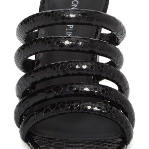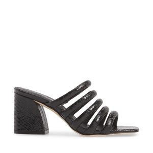 Donald J. Pliner Wes Block Heel Mule. Soft leather upper, lining and sole for ultimate comfort throughout the day. Tubular snake straps and a block heel. Heel height measures 3." Tubular straps with sleek snake embossing balance out the architectural block heel of this statement sandal. Black, snakeskin print, strappy, square toe, open toe sandal.
