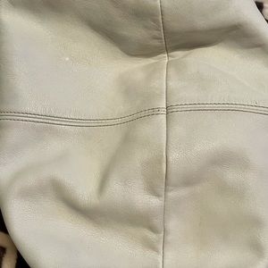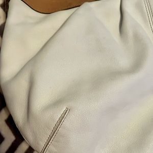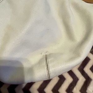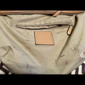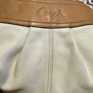 Vintage Coach Soft white leather and tan with silver hardware, wide adjustable shoulder strap, very comfortable to wear, great gently used condition, there are pen marks on the inside (may come out?)😩🤦🏻♀️ measurements are about 12.5x17,