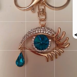 Gorgeous and very sparkly I keychain with large turquoise rhinestones surrounded by reflective white ones. Eyelashes are gold. This would make such a wonderful gift.