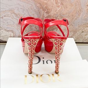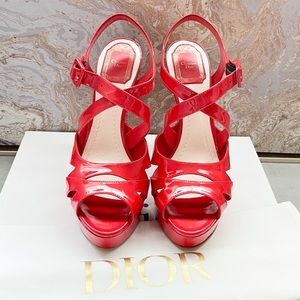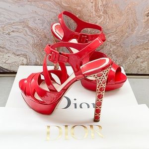 Authentic Christian Dior gold Cannage heel red patent leather sandals. These chic Dior Sandal Heels are summertime perfection! Super cute detailing includes red patent leather with goldtone cannage accents on the heels. These heels are feminine and casual, with leather-padded uppers for a comfortable fit. Very good condition with minor scuffs to soles. Include dust bag.