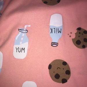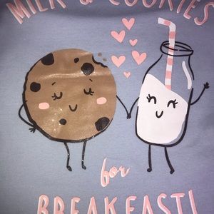 short sleeve pj top shirt reads MILK AND COOKIES BEFORE BREAKFAST with large milk bottle and cookie on it hearts