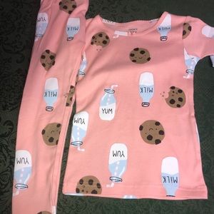chocolate chip cookies print and old fashioned milk bottles print on the other shirt and pajamas bottoms