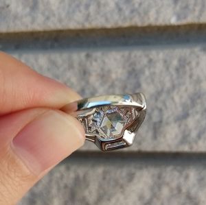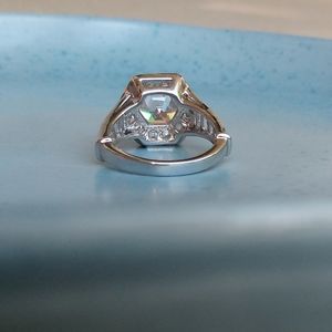 Ring features hexagon, round/ circle, square princess, and baguette cut clear cubic zirconia. Rhodium plated finish.