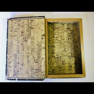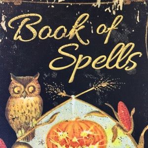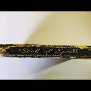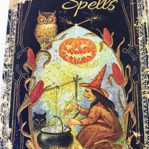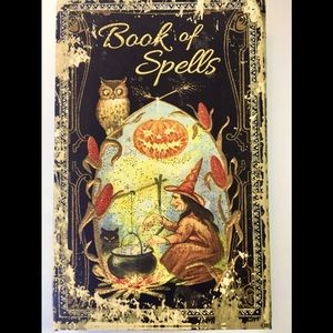 Brand new Halloween Book Box. It has the look of old and worn with an image of a witch stirring her Cauldron with her black cat and owl. The title is Book of Spells. It opens as a box and has a magnetic closure. The back has the same image. It measures 8 1/2” x 5 1/2”.
