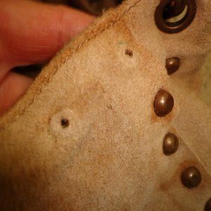 NOTE! I purchased this bag brand new & being I have several bags, I didn't use it all the time. Unfortunately, one of the studs came out & got lost. It is on the inside upper, so it isn't as noticeable when the flap is down. Lovely bag otherwise, & in very nice condition. It is still available at Free People if you want it BRAND NEW.