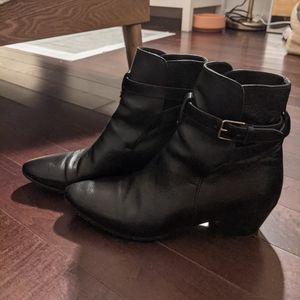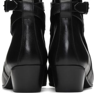 Ankle-high grained calfskin boots in black. Pointed toe. Wraparound ankle-strap with adjustable pin-buckle fastening. Leather lining. Stacked leather block heel. Tonal leather sole with rubber injection at heel. Silver-tone hardware. Approx. 2" heel.